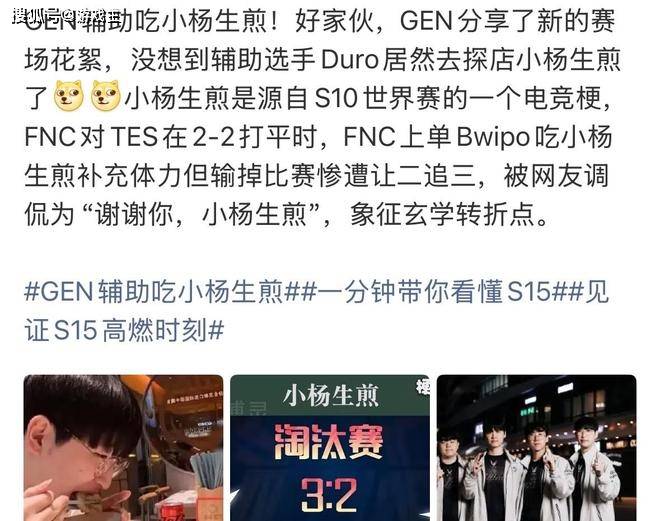 这两天的休赛期,gen战队还是比较轻松的,甚至他们的辅助选手duro还晒出了吃小杨生煎的画面。虽说这是上海的特色,但在lpl赛区也有着不小的魔咒。当年fnc战队和Tes战队的那场比赛还历历在目,开局fnc战队直接拿到了两连胜三个赛点,在如此高压的情况下,大家都觉得Tes战队已经结束了。追到2-2后,fnc战队的上单选手休息室吃了一碗小杨生煎就像变了一个人一样,彻底成为了送财童子,成功助力tes战队完成了s赛淘汰赛上的首个让二追三。此后,世界赛的小杨生煎追平了牛肉面的地位。
