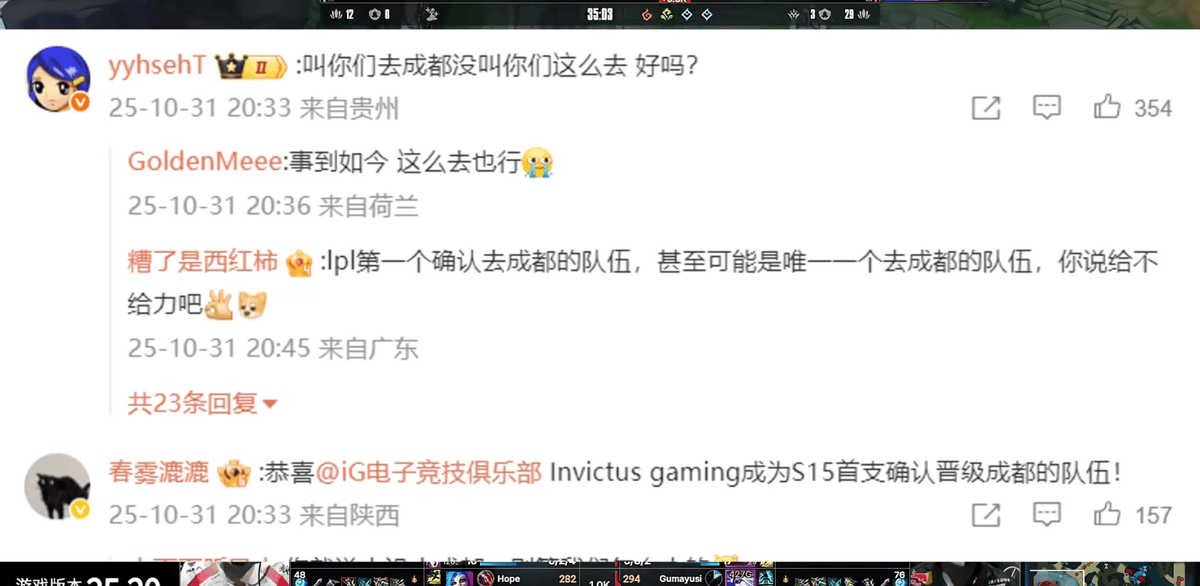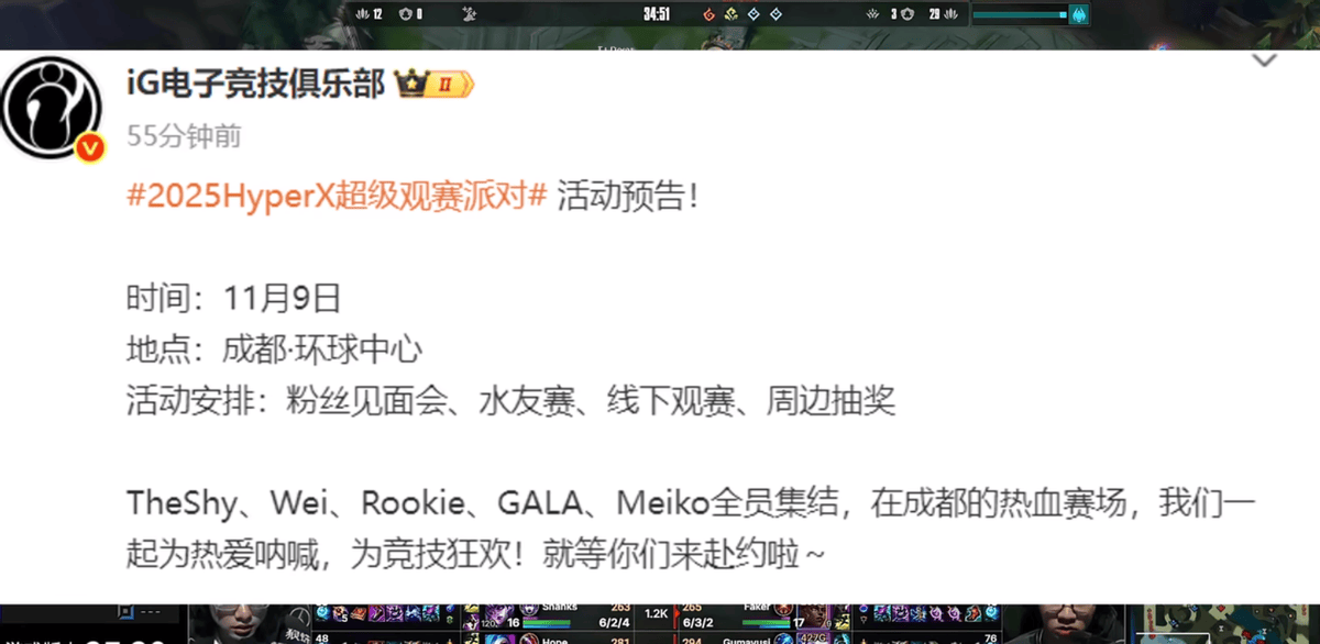 另一支投入比较大的四号种子IG,虽然早早十七强淘汰,但在AL输给T1之后,还是给观众粉丝整了一波活。官方突然宣布,IG全员将在S15决赛那天空降成都,和粉丝以及支持者们一起观赛,并将举行见面会。