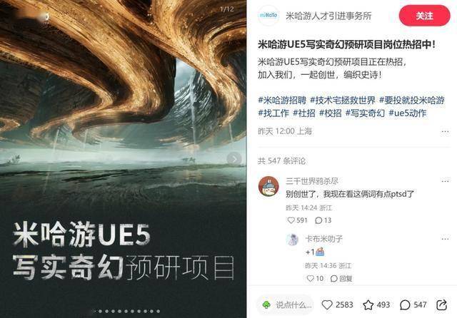 看起来,《原神》开发商米哈游正在采用虚幻5引擎打造一款史诗大作。米哈游小红书“人才引进事务所”专门为这款大作发布了招聘广告,广告提到这款大作将是“写实奇幻”风格,目前尚在“预研”早期开发阶段。