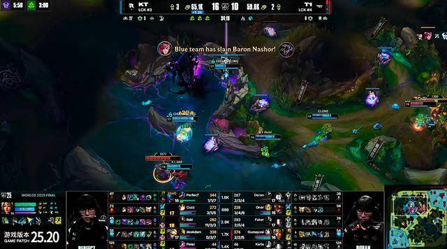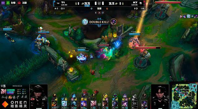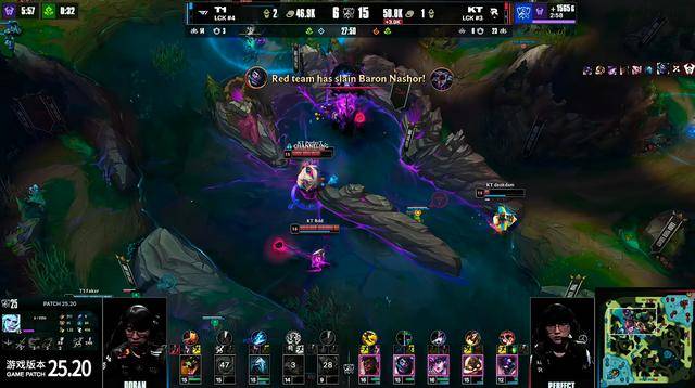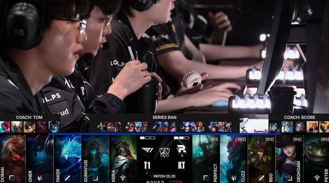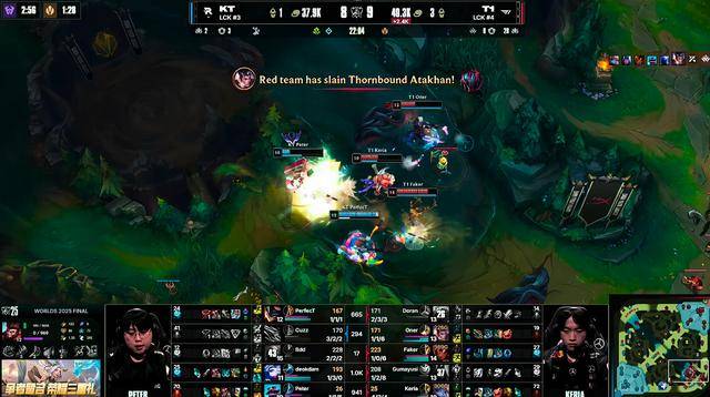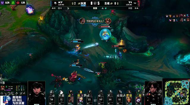 比赛15分钟T1中野在上路主动出手抓Bdd梅尔,KT的支援非常迅速,野辅赶到上路将T1中野击杀,KT随后控下先锋。18分钟Cuzz蔚被T1抓到秒掉,随后小龙团T1将KT其余四人击杀,两队复活后继续争夺小龙打团,KT打出2换5,连续的两波团战,Bdd梅尔输出拉满,反而是Faker有些着急,T1逐渐无法处理Bdd梅尔。