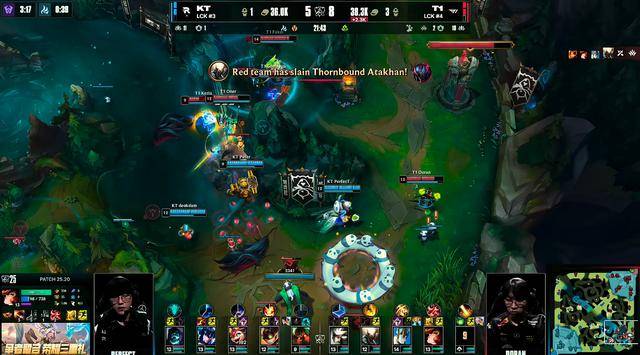T1围绕着Doran青钢影这条线,连续多次针对KT约里克将其打穿,17分钟KT率先落位控下小龙,Doran青钢影直接带队开团,Bdd小火龙收掉T1的两个带有赏金的人头,随后20分钟KT中路抓死Doran青钢影,成功将T1中路一塔推掉。