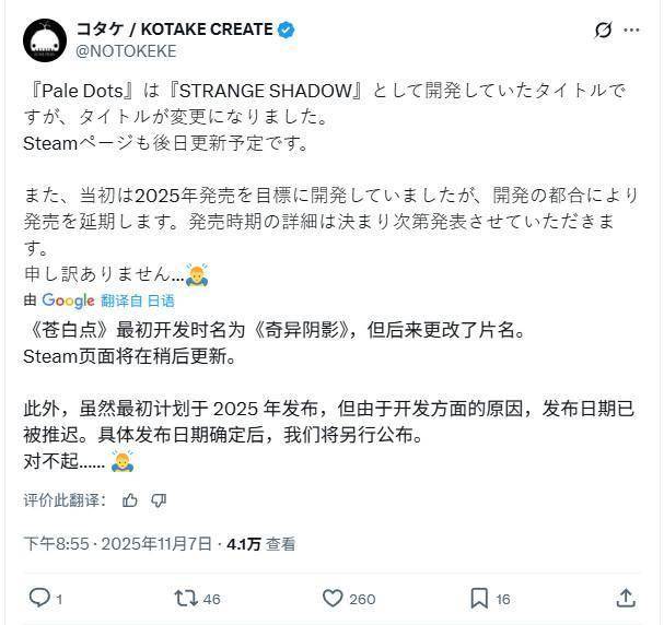 《8号出口》开发商KOTAKE CREATE官推宣布目前正在开发的新作,名称从“ STRANGE SHADOW(奇异阴影) ”更改为“ Pale Dots(苍白点) ” ,Steam页面稍后更新,并宣布延期发售的消息。