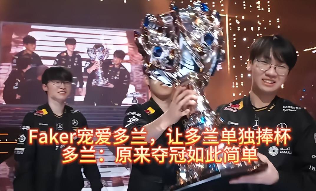 Faker也很宠爱多兰,直接让多兰第一个单独捧杯,真爱了,这样的老大哥,谁不爱呢?多兰心里也在想,原来夺冠如此简单,谁还有梦想,找李哥就行了,妥妥的梦想成就家。
