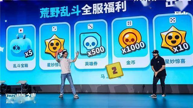 《荒野乱斗》的福利由主创Dani和Marzio亲手掷骰决定。第一次,骰子定格在“3”,现场响起一片鼓励的掌声。Dani与Marzio相视一笑,毫不犹豫地捡起骰子:“One more time!(再来一次!)”第二次、第三次……现场的期待感被彻底拉满。直到第四次,当骰子翻滚后亮出最大的“6”点时,全场瞬间爆发出雷鸣般的欢呼与尖叫,这份“争”取来的顶级福利,让幸福感加倍。