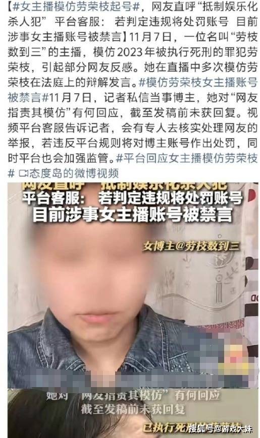 女主播被封杀,因直播模仿杀人犯劳荣枝,再次伤害7个家庭,近日,网络上一名名为“劳枝数到三”的主播因模仿已伏法的女杀人犯劳荣枝,在直播中复现其神态与语气、进行所谓“仿妆”表演而引发舆论愤怒。