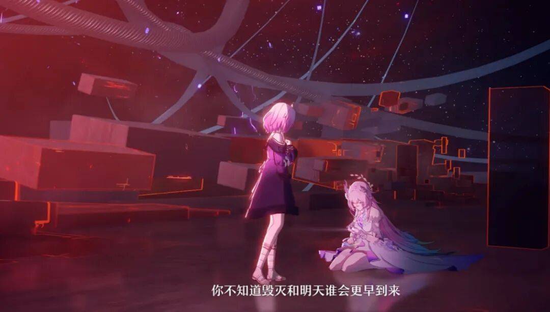 而且,《崩铁》在对记忆主题的探讨上还是留给了玩家足够的想象空间和余地。比如在昔涟的角色PV《再度和你》中,就采用了大小昔涟分开叙事的方式,最终德谬歌在昔涟的鼓励下迈向了明天。你可以当作是昔涟自我的对话,也可以解读成两个不同昔涟的互相成就。