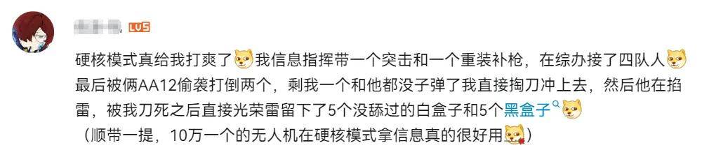 听上去很难是不是?感觉要道心破碎对不对?《暗区突围》玩家的反馈恰恰相反,在很多硬核模式的视频下,我都看到了“真好玩、快常驻”之类的评论。