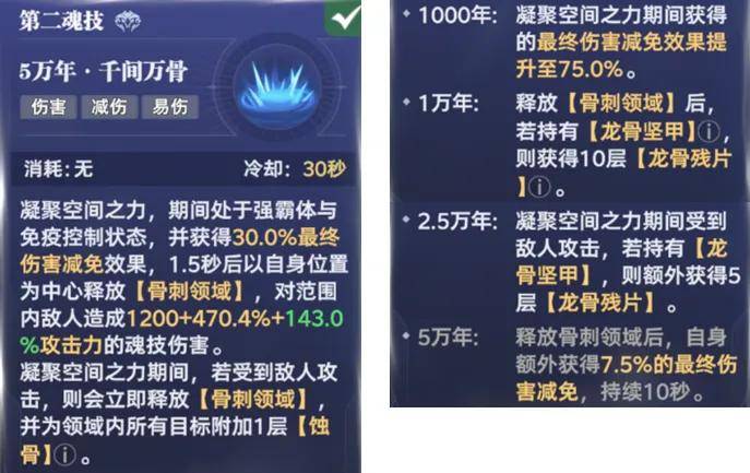 最后古榕的5被动是一个可以将“骨甲”转变为“虚空诡甲”的技能,这里出现了个“中霸体”的定义......此外这个虚空诡甲在被击破时是可以享受到高额的终伤减免效果的,虽然时间不长但效果还不错,当然这个技能也有反伤+提升防御易伤幅度等作用,其也有和空间之门相关的联系,可以考虑456进行组合来使用。