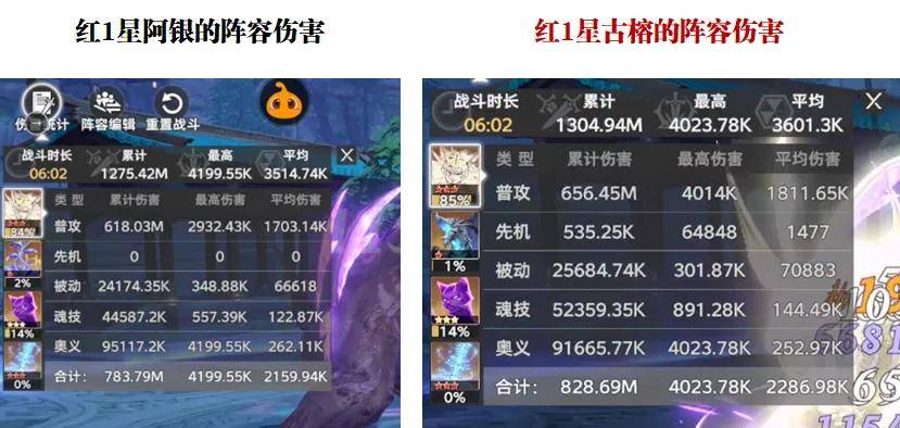 接着至于古榕的这个伤害到底能有多大的效果呢?这里维一给大家展示几组实测后的对比数据,首先是古榕在红色1星时的增伤效果就和同样红1星的阿银类似了,当然这是针对没有韧性条机制的木桩敌人测试而得的结论,有韧性条的话更高星的阿银还是要稍微领衔一些的。