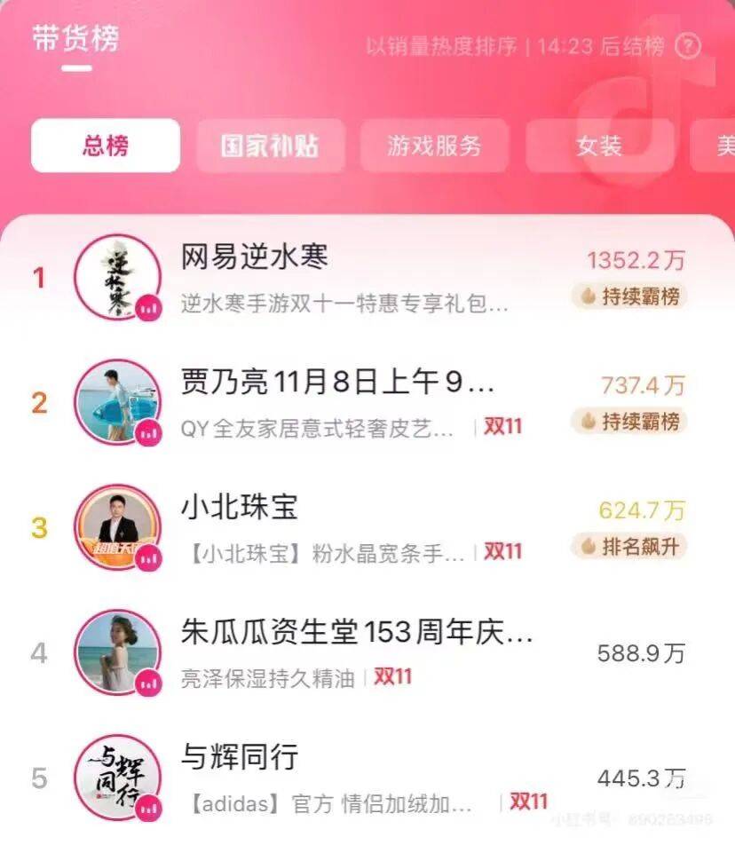最明显的例子就是今年9月,逆水寒手游官方在抖音开启了首场带货直播,在短短的四小时之内就狂圈2500万元,10.8元的凿子一小时卖出33万个,9块9的凿玉盒子也卖出7.3万个,诸多相关周边产品上架之后更是被一扫而空,最终创下3000多万元的收入,直接晋升“抖音带货王”。