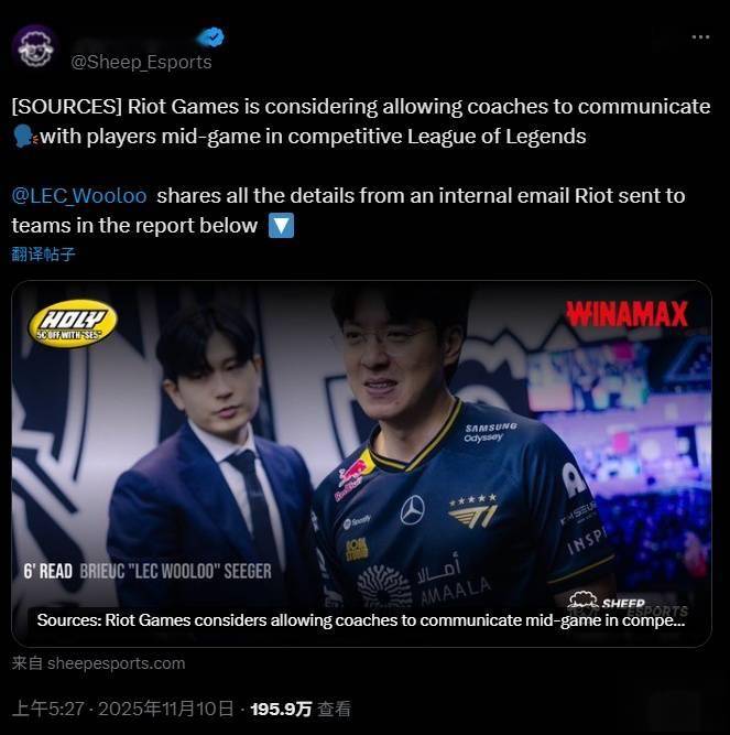 根据拳头游戏发送给职业队伍并经 Sheep Esports 获得的邮件,该公司正在探讨 2026 年赛季的一项规则变更,该变更将允许每支队伍的一名指定教练在直播比赛中的有限时间段内与选手进行沟通。