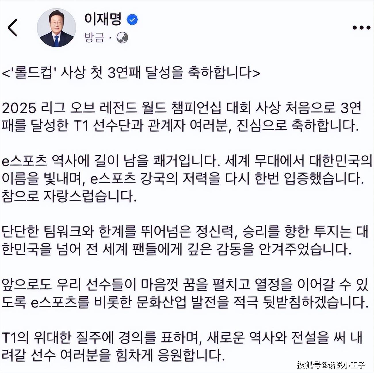 发文的大致内容就是,由衷祝贺你们成为史上首个三连冠的队伍和选手。这将是载入电子竞技史册的伟大壮举,你们将在世界舞台上闪耀着大韩民国的名字,这也再次证明了电子竞技强国实力,我为此感到无比自豪。向T1致以敬意,并继续书写新的历史和传奇的各位选手加油助威。