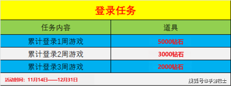 活动内容:累计登录一周、两周和三周游戏,分别可以领取5000钻石、3000钻石和2000钻石,活动规则是每周五刷新周登记数判定,也就是经常错过登录的玩家们需要记得,在活动持续期间每周的周四一定要登录一次游戏,不然第二天就会错过上周的登记了,就相当于少登录了一周,是无法拿满奖励的。