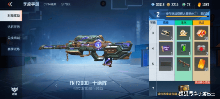 本期的排位武器为FN F2000-十绝阵,在觉醒后是一款非常强力的步枪,拥有高达40点的基础伤害!并且命中各部位的伤害均相同!还有分段式距离修正的独特效果,在适应了这把枪的玩法后会有意想不到的惊喜!而觉醒它就需要在商城用钻石购买十绝之密觉醒宝箱,需要的钻石也不少呢!