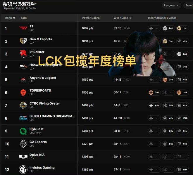 不出意外,排名第一的是拿到三连冠的T1战队,分数高达1662,但他们全年的成绩并不是特别的突出,39胜18负。不得不承认,每一年的世界赛T1战队都是无法超越的,尤其是这个赛季,他们一场不落,从入围赛开始连胜到了最终的决赛。一次冠军可能是运气,但两次三次真的就是团队实力的碾压了。排在第二的是lck赛区的gen战队,说实话,全年他们的成绩都非常出色,只是在半决赛的时候输给了kt战队,感觉如果他们晋级决赛的话,很有可能会夺冠,而且他们全年的战绩是46胜8负,最出色的队伍。