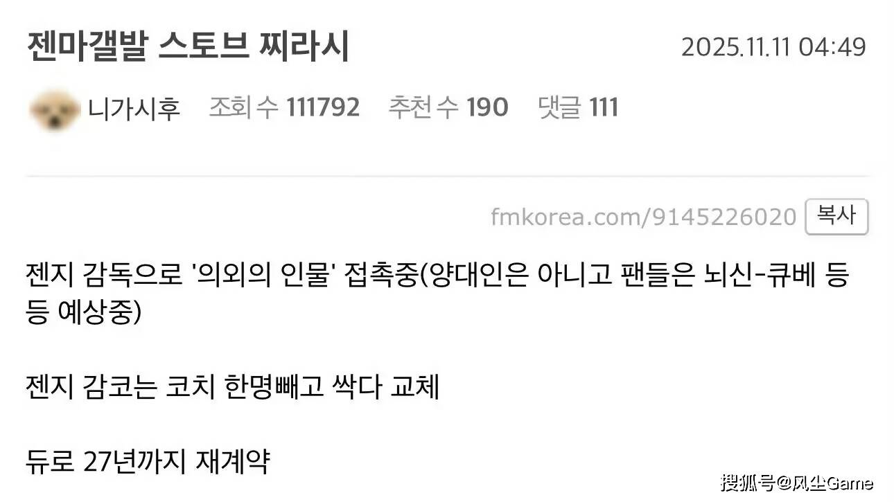 近日韩网论坛有人发帖称:GEN可能有个大新闻,17号要公布两人离队,一个是解约,另一个是不续约,评论区里,有人猜测不续约的是Kiin,因为GEN没抢到卡尔后,就已经有Duro续约的消息传出来了,中下双C都是签到27年,而且离队概率很低,那么解约的就只剩下上野两兄弟了。