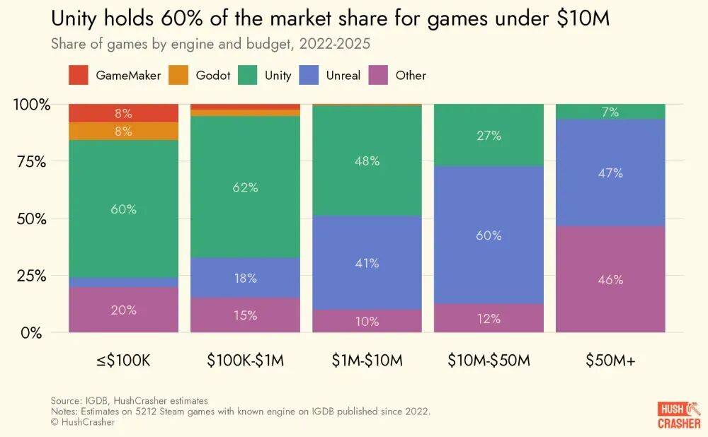 开发成本深刻影响着引擎的选择。显然,在低成本(<10万美元)领域,Unity仍然占据着统治地位。