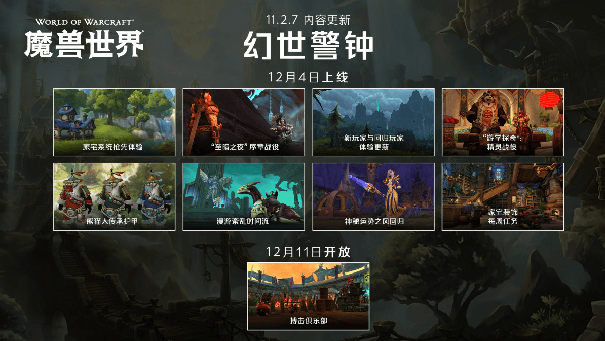 来自暴雪官网消息,《魔兽世界》11.2.7补丁,以及对应的“至暗之夜”序章:“幻世警钟”内容更新,国服将于12月4日上线。