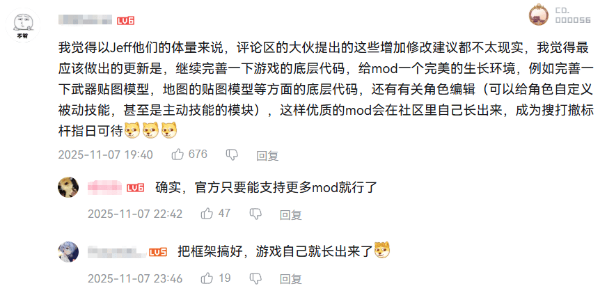 反观玩家在鸭科夫更新动态下面的评论,游戏能让他们说出「原来搜打撤游戏是可以提升玩家体验的呀」的感慨,是多么难能可贵。