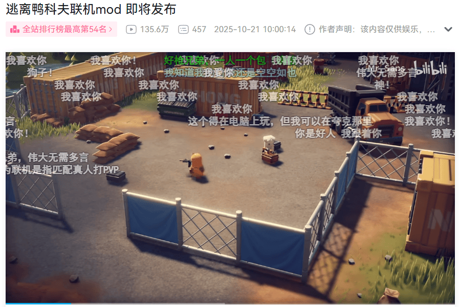 进入11月后,鸭科夫的热度开始降低,同时在线人数也从24万开始逐步下滑,但玩家对Mod的关注度,却依旧坚挺。尤其在B站,鸭科夫Mod品鉴,已然成为最新的流量密码。