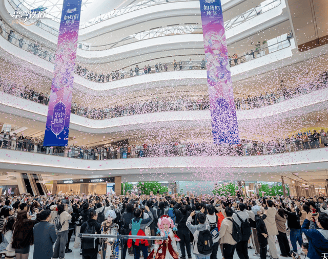 大量的玩家聚集在中庭1楼,见证了这场绝美的花瓣雨落下,这大概就是昔涟口中“11月12日会把天空都染成粉色”的预言吧!有玩家尝试为现在的大伙拍照,还真拍出了黄金裔的穹顶PV图!