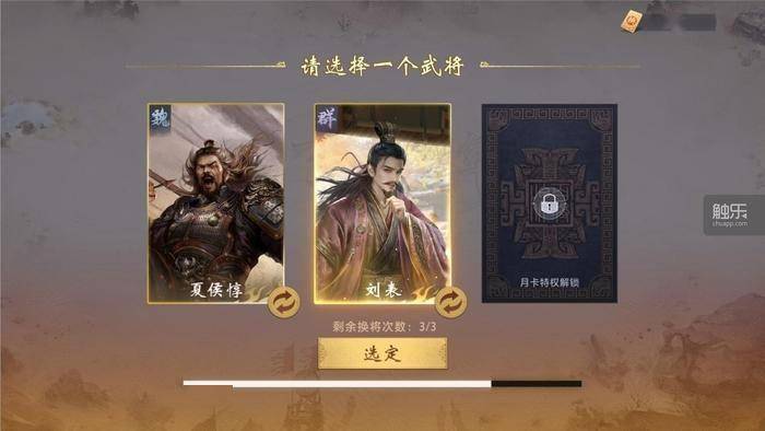 或许是为了防止玩家一直选择强力武将,导致对局单调且不平衡,官方引入了武将轮换机制。每局牌局正式开启前,玩家需要从固定的2个卡槽(充值月卡可额外解锁1个)里选择1个随机的武将,并且只有2次更换机会(玩家官职升到县令后会增加至3次),更换武将也需要用到专属道具“换将卡”,可以通过日常活动和充值获得。这样依赖,玩家就不会只选择同一个强力武将,即使随机到过于弱势的武将,也可以尝试更换。