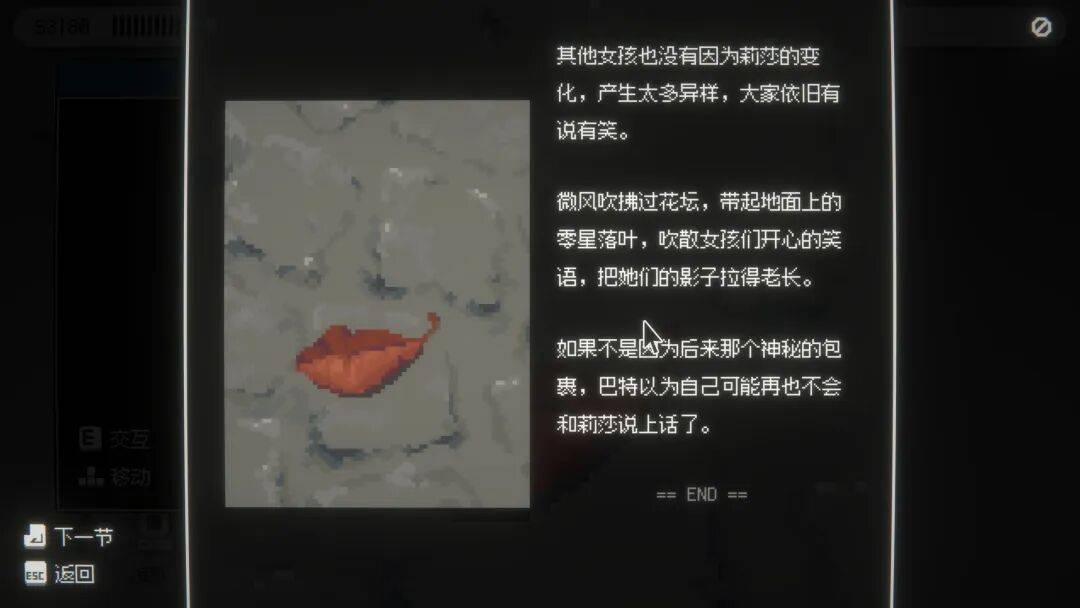 从叙事角度来看,开发者大量使用了“伏笔/预叙”的技巧,如上图中最后一句——“如果不是因为后来那个神秘的包裹,巴特以为自己可能再也不会和莉莎说上话了”。这种文字铺垫几乎贯穿游戏全程,使得读者似乎总比故事中的人物更先一步知道他们的命运。每每读到这些语句,也很容易让我带着一种既定的悲剧视角去看待人物所经历的事件,以及他们的命运。当然,这类充满转折意义和叙事张力的暗示,也增强了读者的期待,让读者在期待中感受无可抗拒的下坠,也许是开发者的另一重目的。