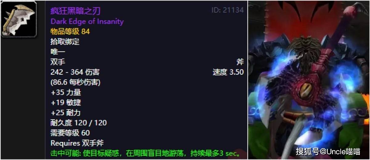 眼球斧的大名必然是传奇的代名词了,被动的3秒致盲效果让其在PVP中也是能够挥出奇迹,当然因为3.5的适宜攻速、高额伤害以及完美属性,PVE也绝对是米锤之前的扛把子双手武器了,喵叔个人觉得,像部落专注于PVP的兽人战士拿他是堪称毕业级的!