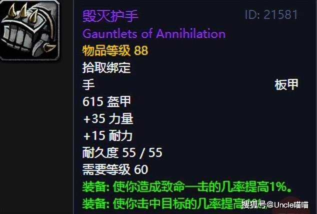 名字带“毁灭”二字的他,实力必然不凡,绿字面板暴击与命中齐聚也是堪称完美二字,更何况还有35点超越极限的力量属性在,虽然说狂暴战还有剑师护手可供备选,但是像喵叔这种板甲强迫症玩家,还是必须带毁灭护手才算正统的,那么就问问各位兄弟,你觉得第四席位的毁灭护手传奇不传奇?