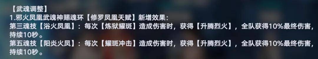 最后胖子的3被动还迎来了一个小幅的会心伤害提升,所以整体算下来大家可以发现官方此次针对胖子的增强逻辑也非常简单,几乎大部分的技能都做了小幅度的数值修复和提升操作,不过这部分只是个锦上添花的意义,更重要的部分还是针对胖子神赐魂环的大幅增强,这个需要花不低成本才能获取的提升才是官方此次对于火队增强的一个核心操作。