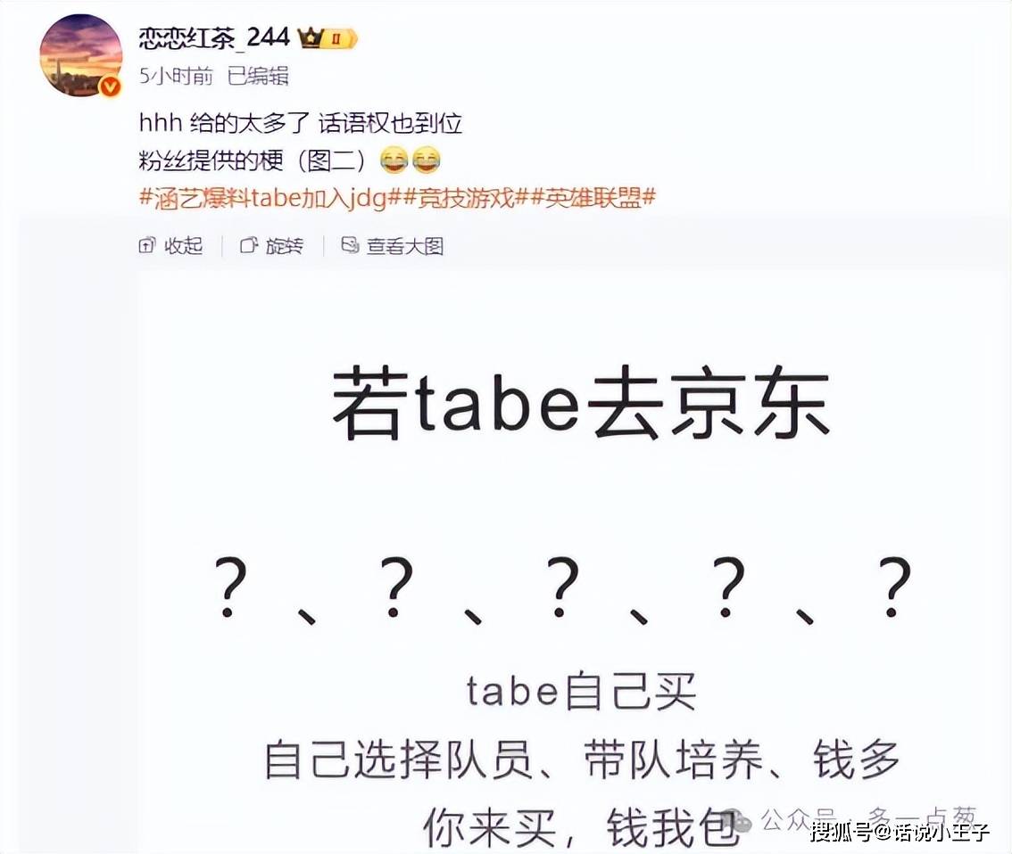 Tabe教练之所以加入JDG,就是因为JDG给Tabe教练开出了天价,给的钱实在是太多了。除此之外,JDG还给Tabe教练很大的话语权,可以让Tabe教练自己选择队员带队培养,只要Tabe教练提出需求,那么剩下的全部由JDG来包办。