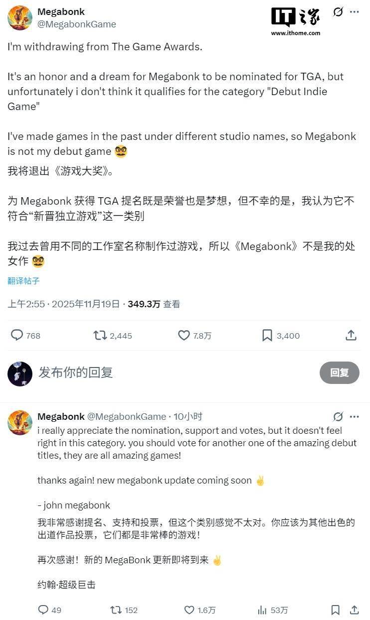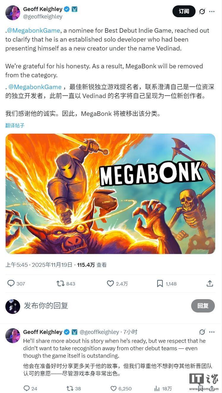 IT之家注意到,在此声明发布后,TGA 的创始人 Geoff Keighley 也发表了自己的声明,承认了这一请求,并表示《Megabonk》将从提名中移除。“他会在准备好时分享更多关于他的故事,但我们尊重他不想剥夺其他新晋团队认可的意愿 —— 尽管游戏本身非常出色。”