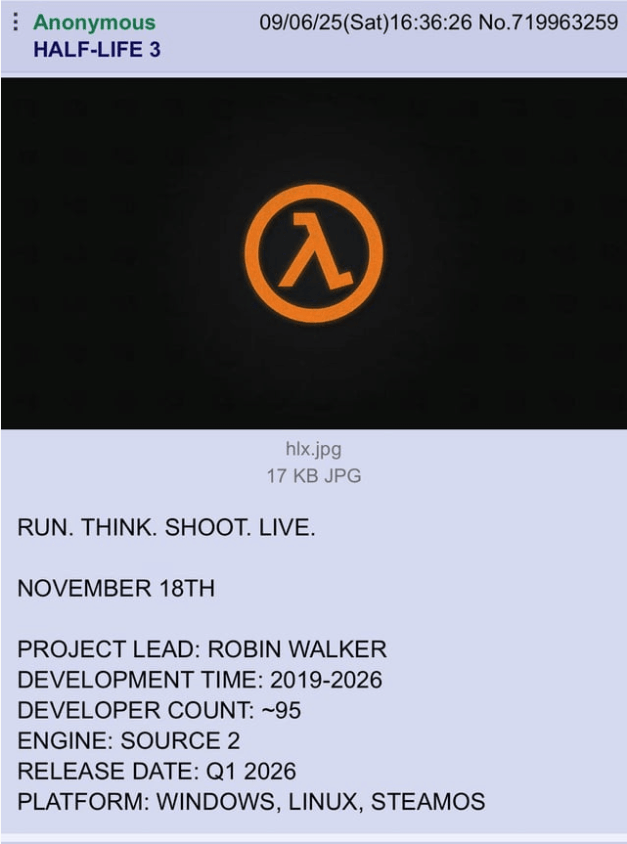 需要注意的是,在《半条命3》传闻持续流传二十年之后,近期关于该作即将推出的各类传言再度兴起。有爆料者声称,《半条命3》将于今年11月18日正式公布,并计划于2026年第一季度发售。