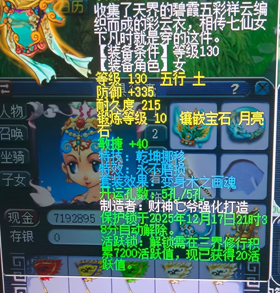 昨日,一位少侠鉴定130级装备时,不仅解锁了“逆天的双蓝字”成就,更收获了一件单加40敏捷、兼具不磨与乾坤挪移的女衣。从属性来看,这件装备堪称任务与帮派联赛的双用神器。