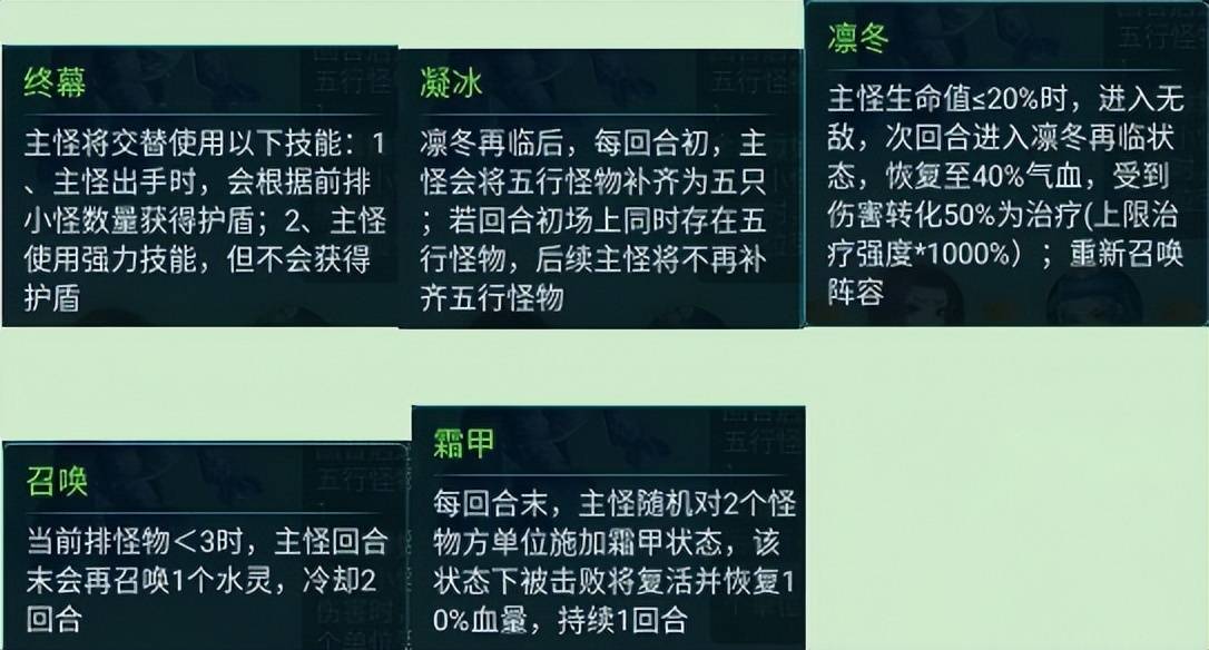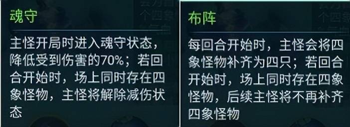 因为场上同时存在水、土、火、风这4种四象怪物,主怪将解除减伤状态,那么我们在开场时,要先对前排同名小怪中的一个进行集火,如此反复,直至场上存在4种四象怪物为止。此时主怪已没有减伤状态,我们可以放心对其输出。期间需要注意不要把四象怪物给打掉,不然主怪召唤同名四象怪物出来,又能拥有减伤状态。
