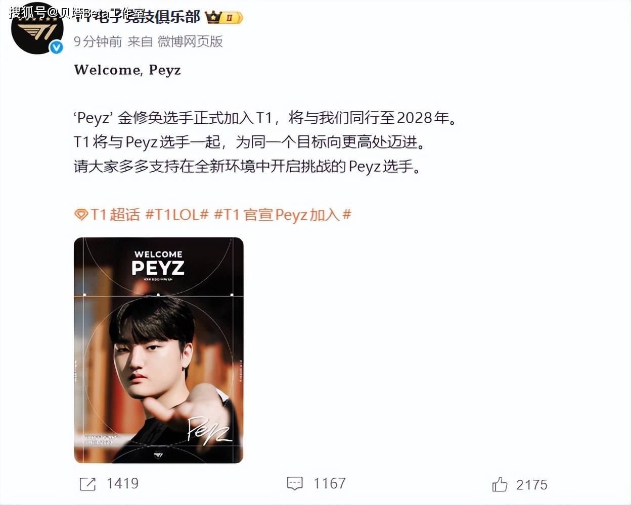 首先是T1官宣了peyz加入的消息,表示Peyz将和T1一起同行至2028年,一起为了同一个目标迈进,希望大家多多支持Peyz选手。