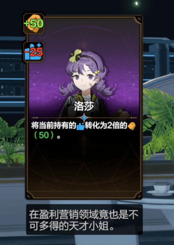 比如这个叫洛莎的角色,虽然可以增加你的营业额,但是会减少你的好感度,所以需要搭配一些涨好感度的客人来使用……不过姬现在还没遇到多少可以疯狂涨好感度的客人,所以对于姬来说这个洛莎目前有点鸡肋。