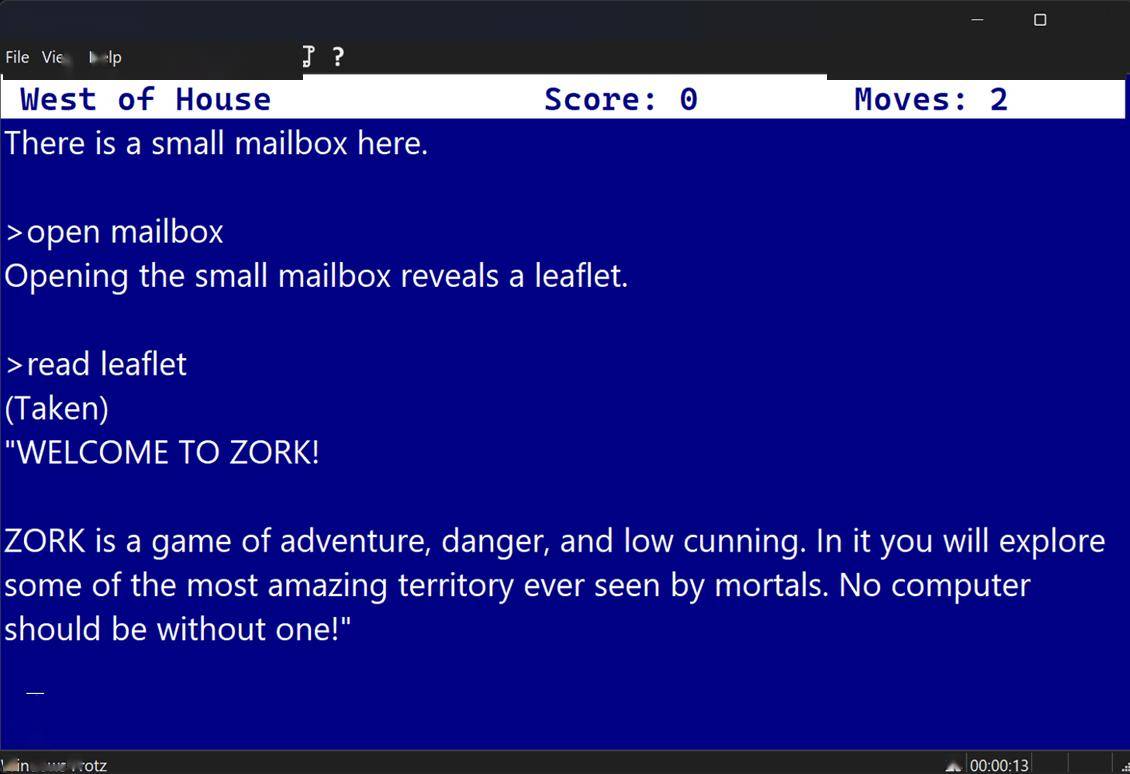公开资料显示,《Zork》是电子游戏史上最早的一款文字冒险游戏,是 Colossal Cave Adventure 的一个早期后继。