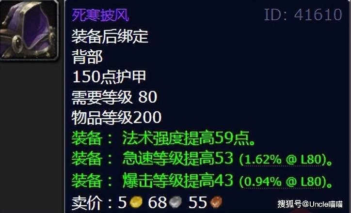 目前魔兽世界泰坦时光服也是肉眼可见的火爆,喵叔昨儿个晚上只是出去骑车遛弯一会会,回来就挤不进去了,不过这种情况以雷火的行事风格,应该基本上月底前就能解决了吧!回归正题,第一款推荐的就是裁缝的死寒披风,这东西要是再给安排一个插槽和些许属性,那就不是简单的恐怖如斯直戳天花板那么简单了,其威压甚至有可能洞穿版本前中期无压力,当然设计师应该也知道不能让其如此这般超模,所以只给了炸裂的绿字面板,不过对于团本初期已然够用,法系输出职业可以无脑冲,喵叔是100%推荐!