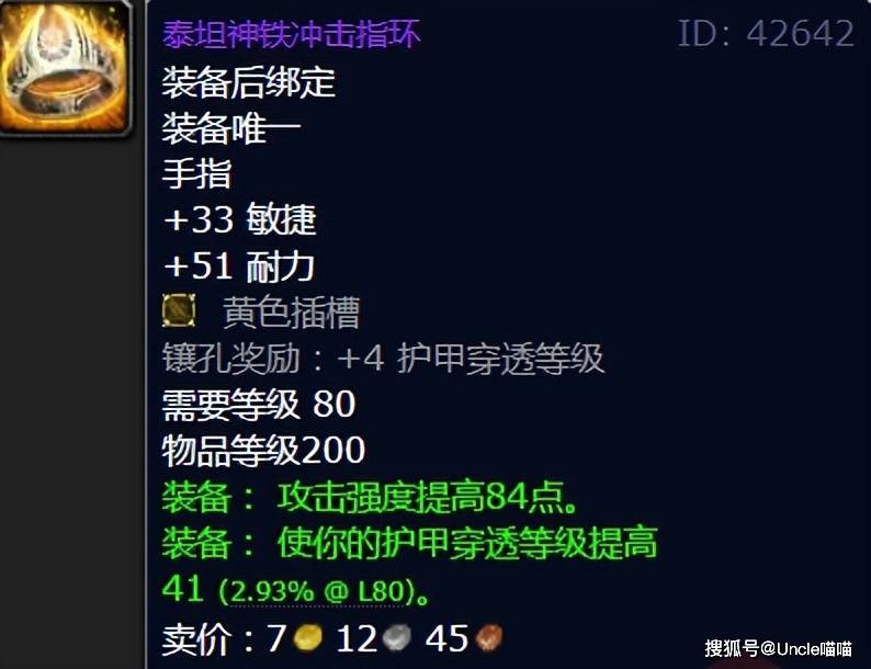 当然提及泰坦神铁系列的话,必须少不了这款冲击指环了,同样是珠宝加工出品,这东西猫德、狂暴战亦或者战斗贼喵叔觉得都能堪大用,初期搭配肯瑞托指环可谓完美闭环组合,脸黑点估摸着能带很久!