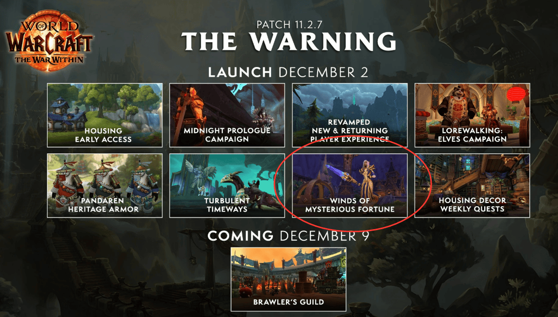 此外,计划于12月4日跟随11.2.7补丁上线的经验Buff“秘运势之风”被取消了,可能是暴雪觉得军团重混、21周年庆、时光漫游这些一起的加成太高。