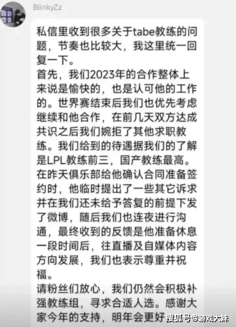 真正让这件事引发争议的,是Tabe过往那段被再次翻出来的“续约风波”,2023年,他在BLG的执教成绩无比亮眼——MSI亚军、S赛四强,多次击败T1、GenG等LCK强敌,这样的战绩让他成为炙手可热的教练,BLG原本在赛季结束后就准备优先续约,可Tabe却突然在官宣前发了一条“自由人求职内容”,这让粉丝以为BLG留不住人,引发大量舆论压力。
