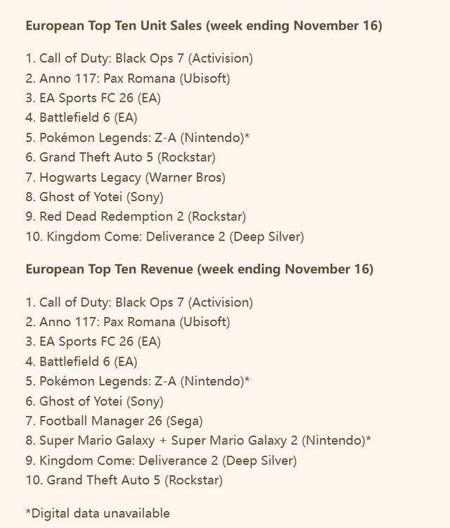 尽管《使命召唤:黑色行动7》成功登顶上周欧洲地区游戏销量榜,但其市场表现较前作及竞争对手出现显著下滑。根据GSD统计数据显示,该作实体版与数字版的首周总销量较《战地6》同期低63%。