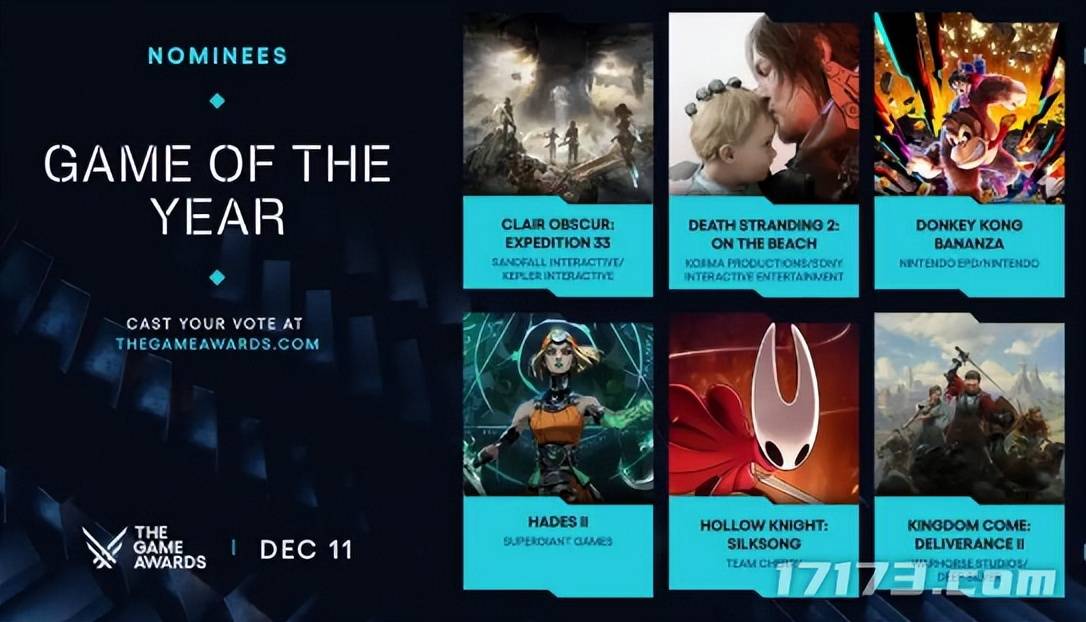 今年最佳游戏的提名名单包括《光与影:33号远征队》《死亡搁浅2》《咚奇刚:蕉力全开》《哈迪斯2》《空洞骑士:丝之歌》《天国拯救2》。