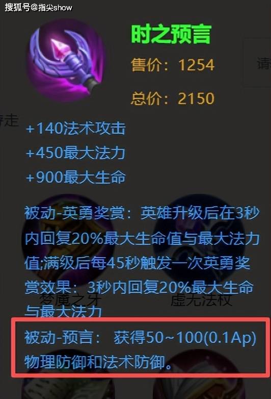 本身是法系的半肉装备,有法强,有续航,有不错的双抗,但是在调整之后,合成件进化水晶没了,且大幅抬高了双抗需要的法强比例,也就是说,想要有原本进化水晶被动的buff,就只能直接合成大件,但前期合成,你的法强不高,被动的双抗加的也很可怜。