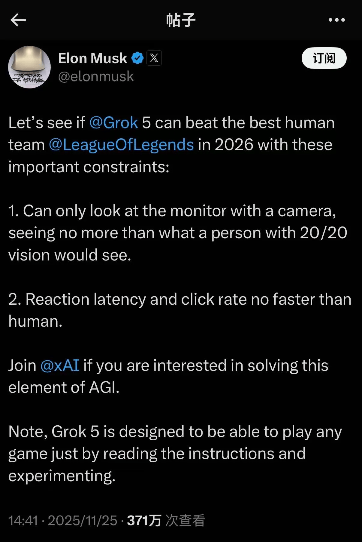 11月 25 日,马斯克在 X 上发布了一则“挑战书”,要让 Grok5 在英雄联盟游戏中挑战人类顶尖战队,这或许是历史上首次 AI 与人类的 5v5 的大型对线。