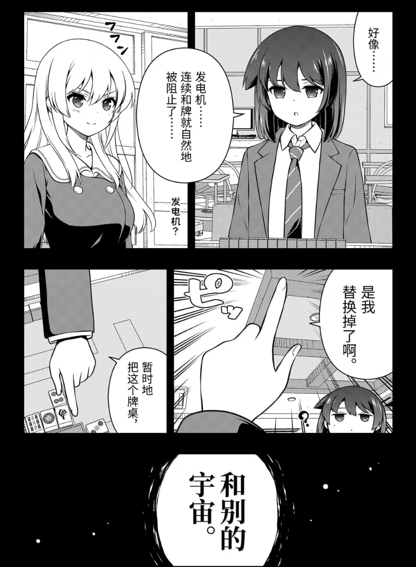然后在最新一话中大星淡一直都被隐藏的第七个必杀技终于曝光,而且比起之前的“在听牌时扭曲空间看到牌山里可以胡的牌”的名为“引力波”的技能更加过分……这次的效果直接就是“暂时把牌桌和别的宇宙替换掉了”……这是原文,不信你们看。