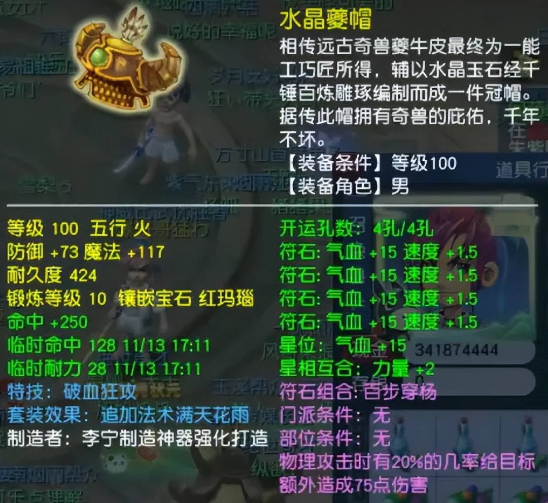 100级破血满天男头,初防高达73点,镶嵌10锻红玛瑙。破血的效果是对同一目标连续发动两次普通攻击,可用于清宠或点杀。