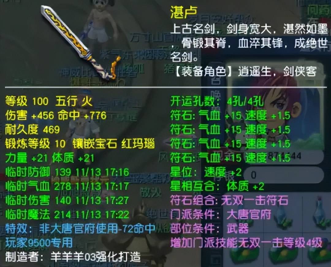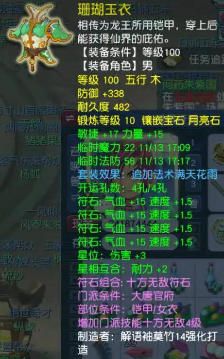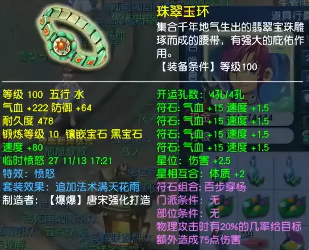 100级愤怒腰带,气血222、防御64,打了10锻黑宝石。愤怒特效属于PK人眼中的完美蓝字,满天套也是大唐的最完美套装。