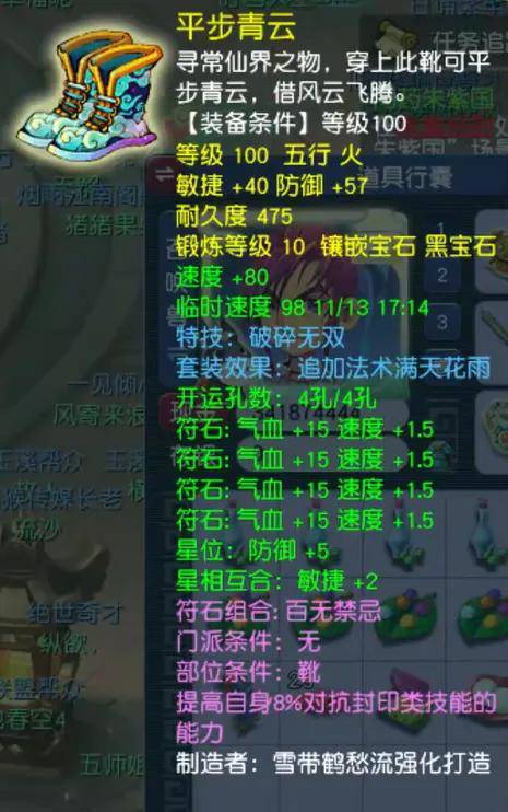 100级满天破碎鞋子,敏捷40、防御57,镶嵌10锻黑宝石。破碎可造成对方一次物理伤害并削减等量蓝量,比较克制脆皮单位。